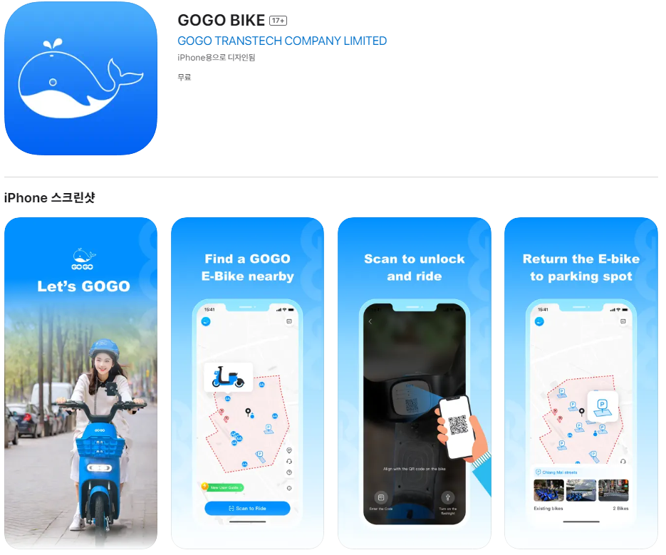 지금까지 위에서 언급한 교통 수단은 치앙마이에서 일반적인 교통수단이다. 공유 전기 바이크는 23년 12월부터 도입된 새로운 방식의 교통 수단이다. 그래서 정보가 많지 않다. 이용 방식은 고고 앱을 깔고 이용 시간에 따라 비용을 지불한다. 10분에 20바트이고 이후 1분 마다 3바트가 추가로 발생한다. 1분에 한화로 120원정도가 되니 30분에 3,600원 1시간에 7,200원의 비용이 발생하는 셈이다. 길게 타면 비싼편이다. 10분내로 짧게 이용할 때 800원 정도가 발생하는 편이니 짧은 거리에 사용하면 좋다. 속도는 전기 자전거 수준이다. 스쿠터 보다 현저히 느리다.(대신 안전한가? ㅎ)