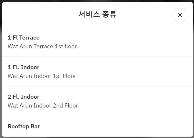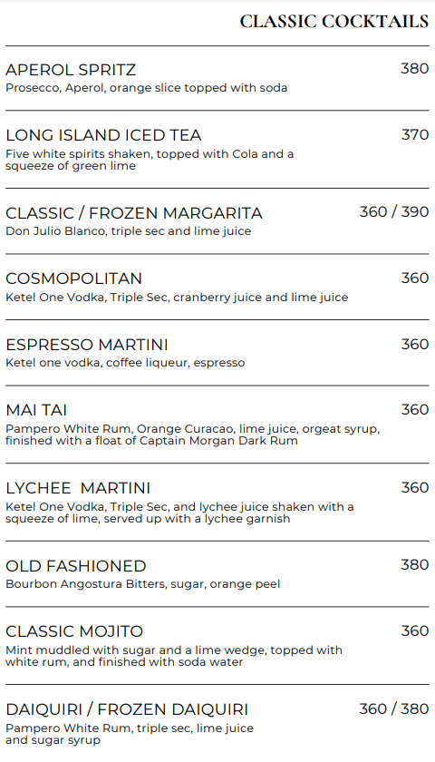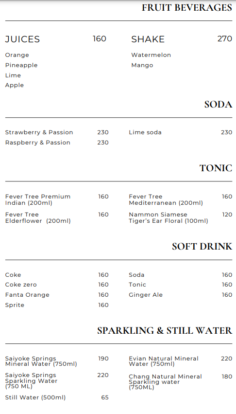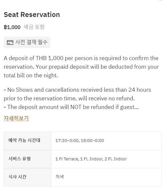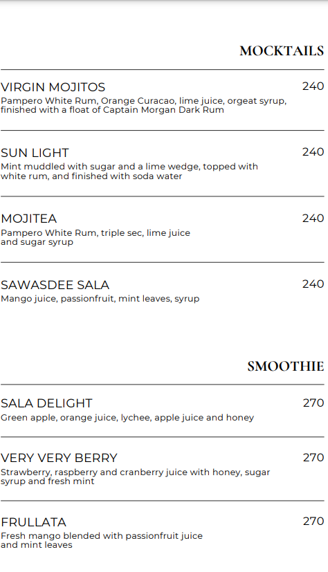 2~3시간 야경을 중심으로 부담없이 즐기려면 루프탑바 가장 좋은 선택이 될 수 있다. 레스토랑에는 사람이 몰리기 때문에 비교적 루프탑바는 사람이 적다. 예약없이 워크인으로 루프탑바에서 야경을 즐겼다는 후기를 볼 수 있다. 가격도 부담없다. 140바트부터 시작되는 커피와 차, 240바트부터 시작되는 맥주를 비교적 부담없이 즐길 수 있다. 120바트 부터 시작되는 루프탑 메뉴도 간단하게 곁들일 수 있다.