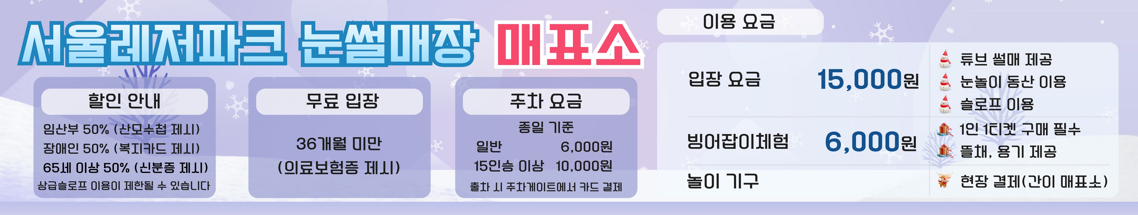 | 이용 요금 | 입장권(썰매 포함) : 전연령 15,000 빙어잡이 체험 1인 : 6,000 놀이기구 : 현장결제 |