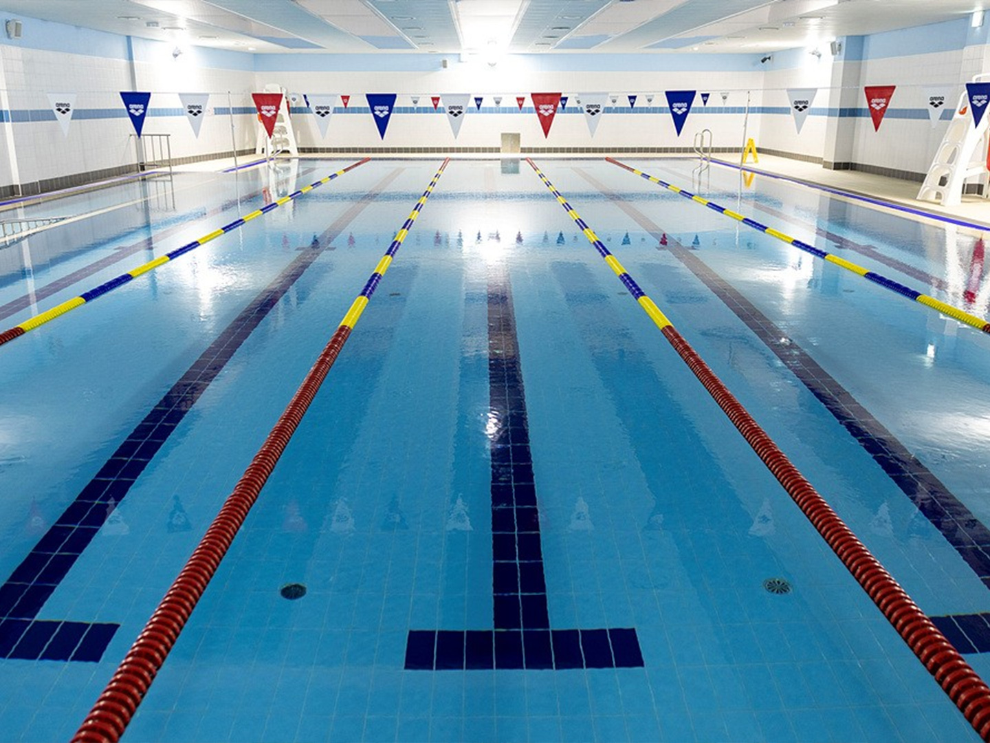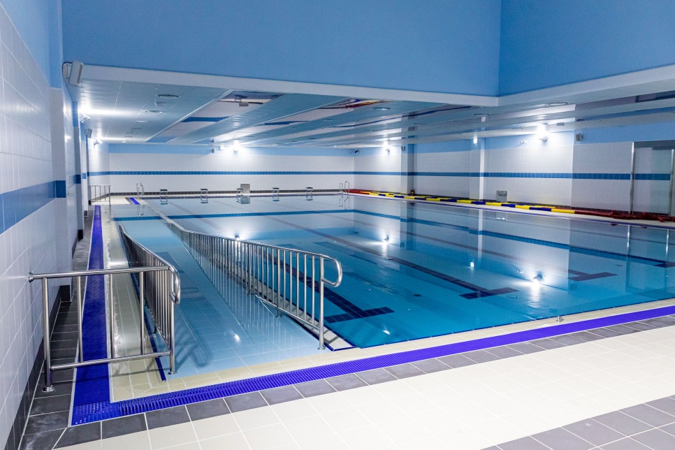 도서관에서 마음의 양식을 쌓았다면, 이제 몸을 풀 차례입니다. 지하 2층으로 내려가면 최신식 수영장이 기다리고 있습니다.