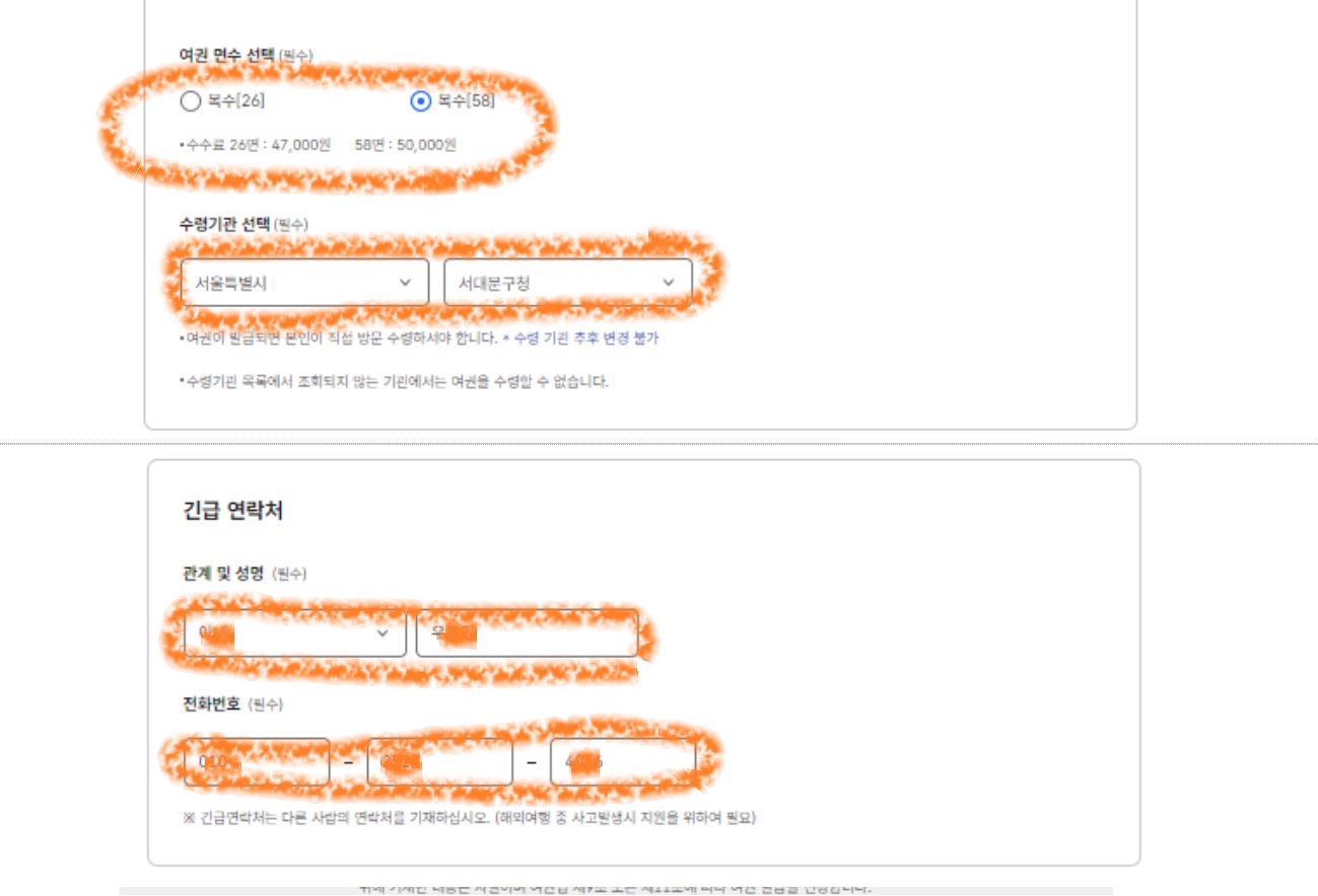 -여권 면수 및 수령기관 선택 & 긴급 연락처 기재