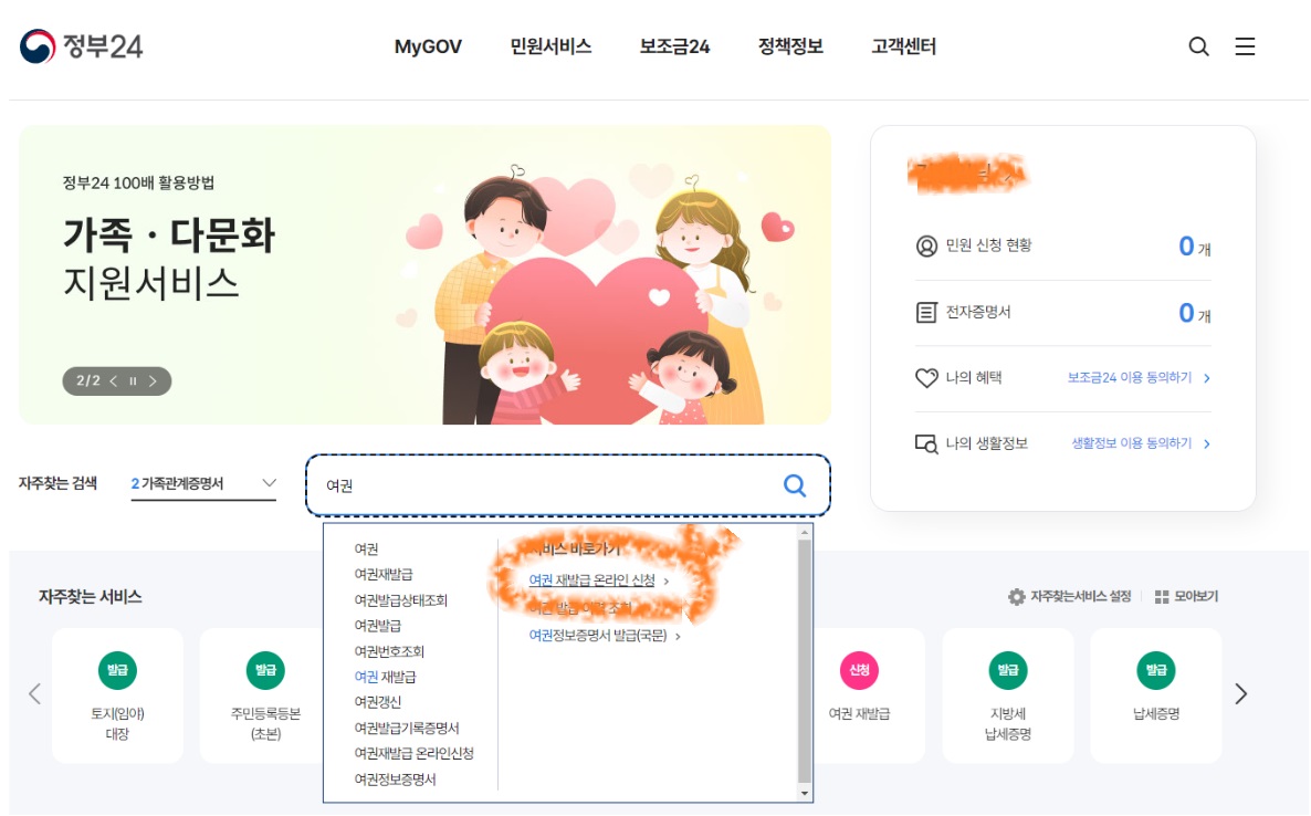 a. 정부24 홈페이지로 이동 > 로그인 > 여권 재발급 온라인 선청 검색 후 이동