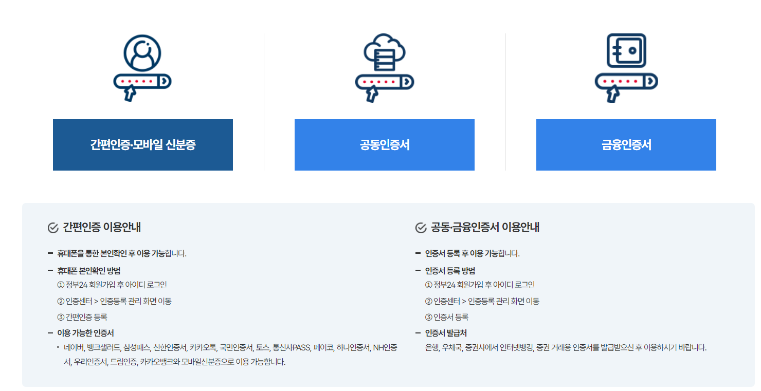 (정부 24로그인은 가편인증 / 공동인증서 / 금융인증서 등을 사용할 수 있다)