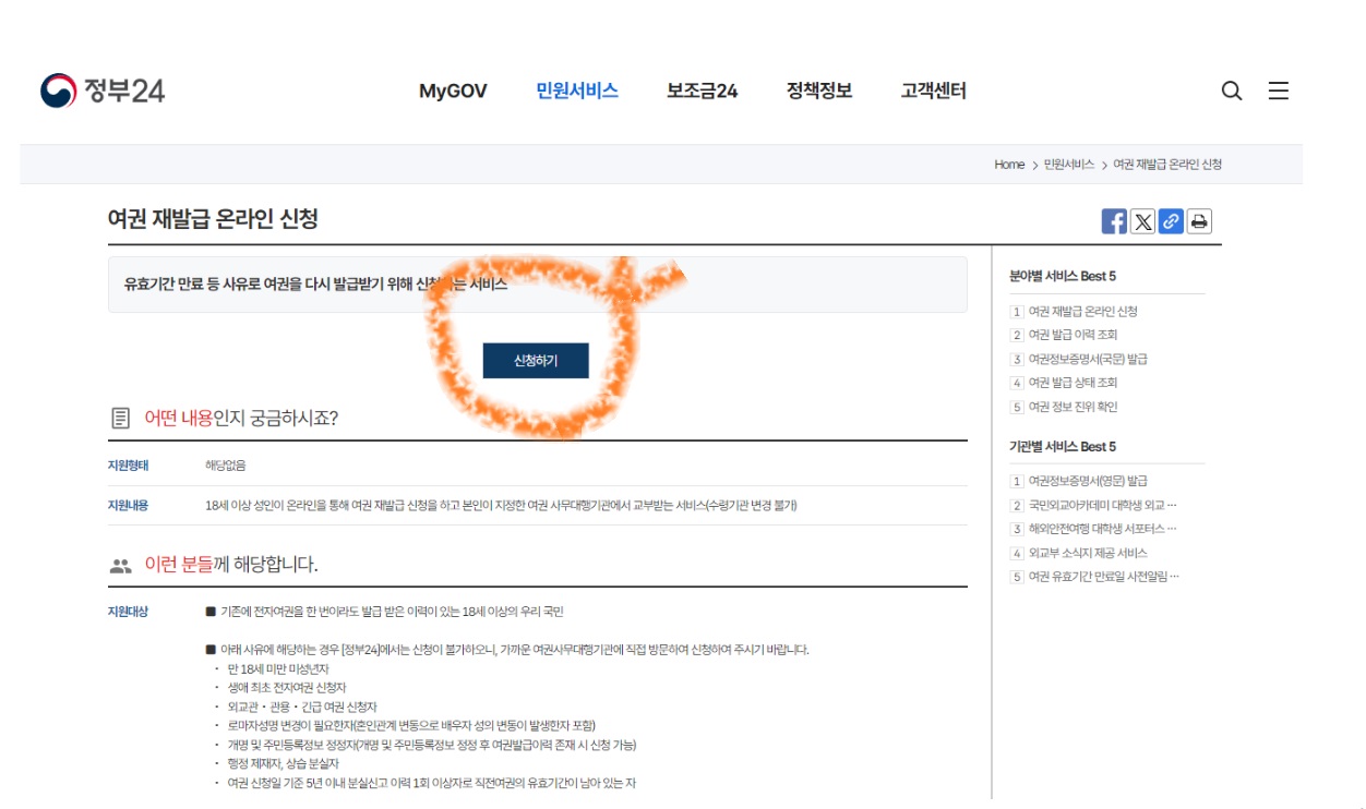 b. 여권 재발급 온라인 신청 메뉴에서 신청하기 선택