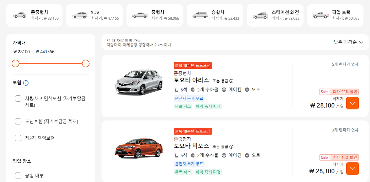 | 자동차 렌탈 - 클룩 | 하루 2.8만원 부터~36만원 | 주로 공항에서 픽업해서 공항으로 반납하는 방식 |