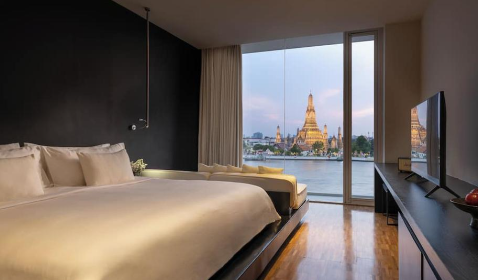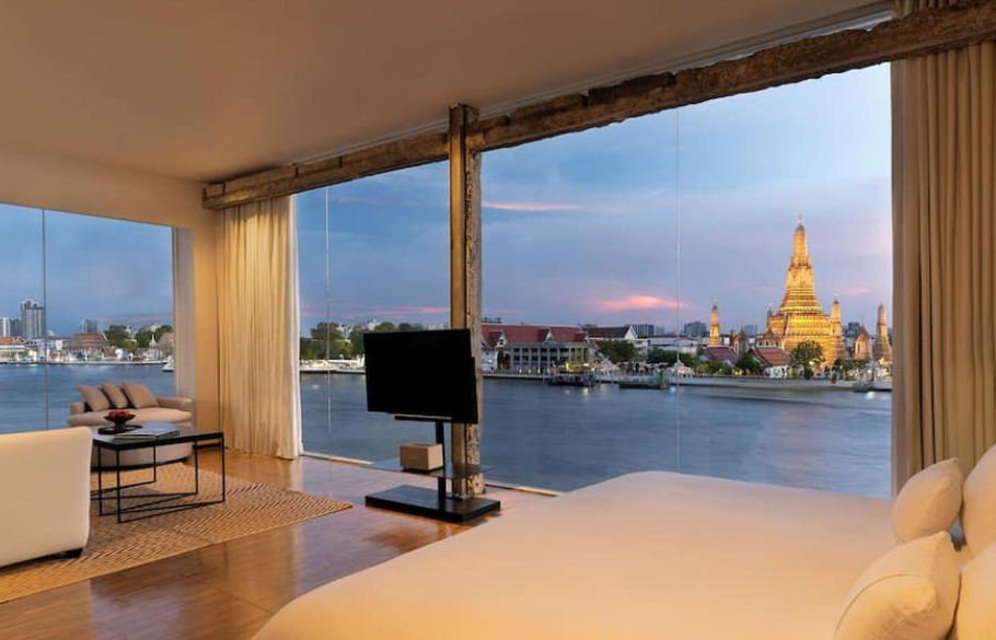 객실 뷰는 기본적으로 이런 곳이다. 통창으로 되어 있고, 자세히 보면 창문앞에 소파가 있다. 마음껏 뷰를 감상하란 의도가 다분히 들어난다. 인터리어는 모던하고 심플하다. 왓아룬의 클레식한 뷰와 공간이 대조되면서 더욱 감각적인 분위기를 즐길 수 있다.