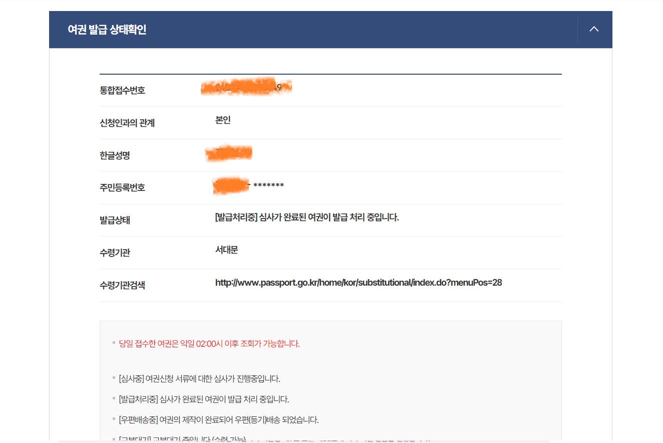 신청 직후에는 심사중이라고 뜨더니 몇일 5일 후 다시 확인하니 심사가 완료된 여권이 발급 처리 중이라고 뜬다.