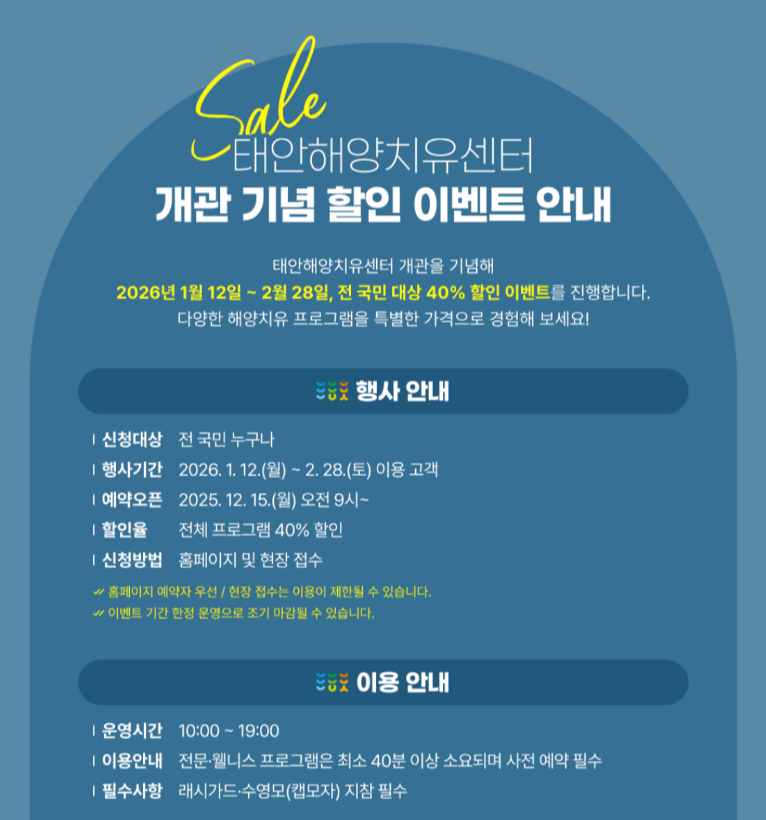 - [공식 홈페이지 예약 바로가기 버튼] 👉 태안해양치유센터 프로그램 예약 및 잔여석 확인